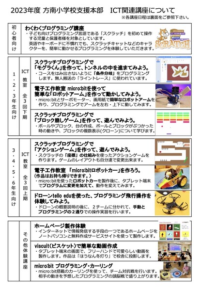 学校の教職員様は、多岐に渡る既存カリキュラムへのご対応で精一杯なケースが多く、ギガスクール構想に代表されるITC関連の実習にまで手が届いていない地域が多々見受けられます。こうした状況を改善すべく、地域住民の方々をスタッフとして巻き込んだITC連続講座を企画し、2023年度から杉並区立 方南小学校様で毎月開催しています。本活動は学校支援本部様からもご支援をいただいておりまして、今後の予定としては、11/11,12は簡単なスクラッチゲーム作り、11月下旬には動画アプリ「ビスケット」を使ったプロジェクションマッピング用動画の製作(12/2,3の小学校でのイベントで校舎に投影)、12/16,17はmicro:bitを使った電子工作、1/13,14はスクラッチを使ったブロック崩しゲーム作りを開催予定です。こちらの活動へのご参加もご検討いただけますと幸いです。子ども達のITスキル向上はもとより、地域住民の皆さんが子供達と交流できる場を、これから広げていきたいと考えています。子供達と一緒にプログラミングを楽しんでもらえる方からのご応募をお待ちしております。