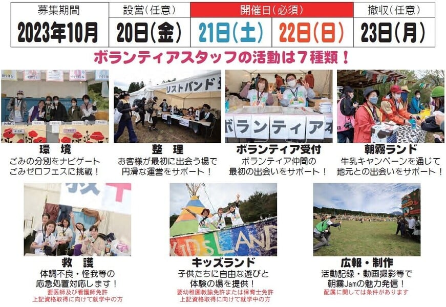 ●募集活動部署:整理・環境・ボランティア受付・救護・キッズランド・朝霧ランド・制作 |