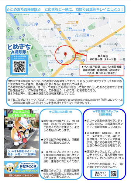 9/18月曜祝日に「とだロコピクニック♪」の会場を綺麗に保ち来場者を迎えるため「とめきちお掃除隊」が清掃ボランティアに参加します!とめきちと一緒に、お祭り会場をキレイにしませんか?
