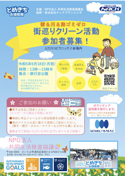 - 9/18 (月・祝)戸田市「修行目公園」清掃ボランティア(とめきちお掃除隊)