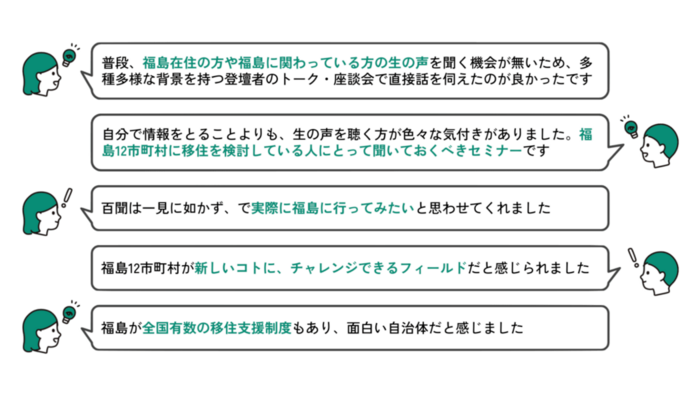 この移住セミナーは「何か新しいことにチャレンジしてみたい」「自分の経験やスキルで地域に貢献したい」「福島県の復興のために出来ることを探したい」などの思いを持った、あなたに向けたセミナーです。福島12市町村や先輩移住者のリアルな声をきくことができたり、移住専門スタッフや先輩移住者に直接質問・相談できる時間もご用意していますので、ぜひお気軽にお越しください。