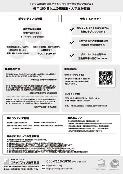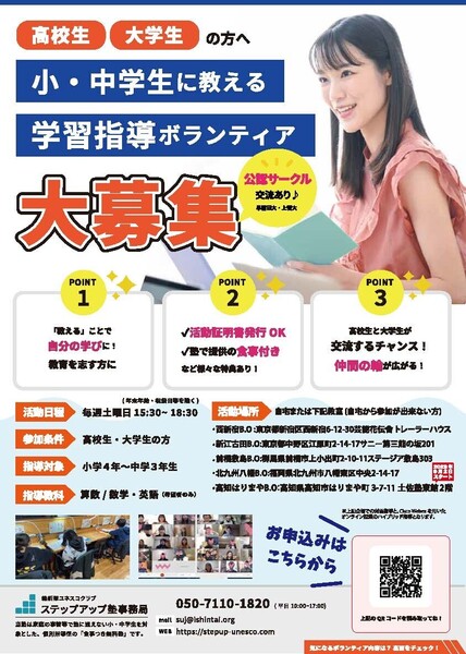 教育格差是正を目的に活動を続ける当塾は、日本ユネスコ協会連盟との提携のもと都内二ヶ所・群馬県前橋市・福岡県北九州市(FC)に加え、高知市内で新教室を開室したため現地指導可能な学生を募集します。