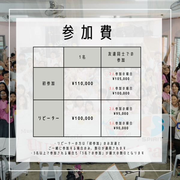 友達割をご利用の方は、お友達と同日でのご応募をお願いします。4名以上での参加は、3名同時割引の金額といたします。
