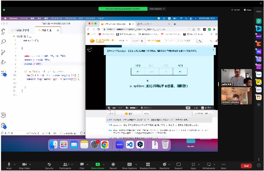 動画教材(英語も含む)を使用しながら、フロントエンド言語で必須になるHTML / CSSの基礎に加えJavaScriptを習得できるよう取り組んでいます。今後はJavaScriptのフレームワークであるVueをメインに学習の幅を広げるため準備しています。