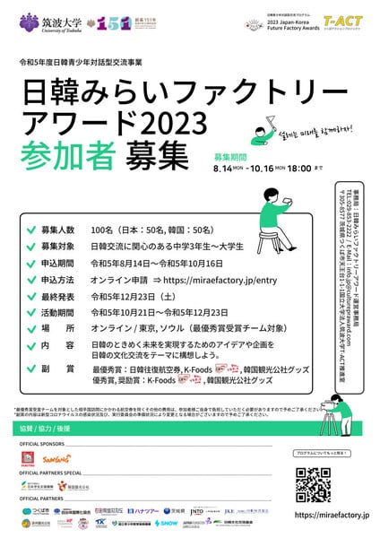 この募集の受入団体「筑波大学日韓みらいファクトリーアワード運営事務局」をフォローして、