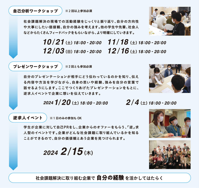 ソーシャルリクルートは、「社会課題の解決を仕事にしたい」という学生の就職活動を応援する取り組みです。自己分析やプレゼンのWS、社会課題の解決に取り組む企業に出会うマッチングイベント等を行います。