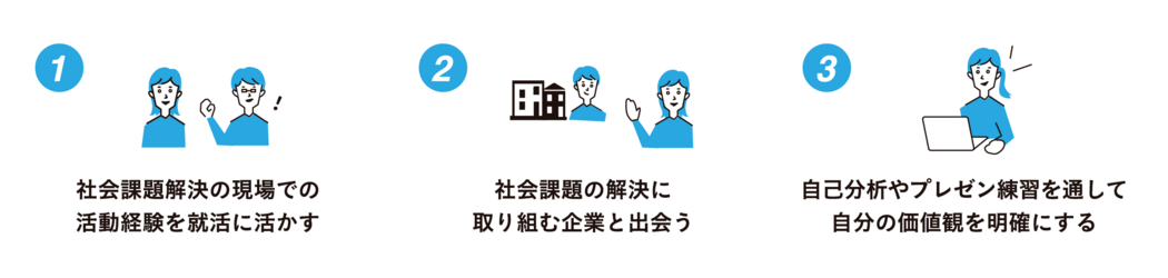 社会課題解決の現場で悩みながらも取り組んだこと、そこで向き合った自分のこと、そこで感じた世の中への矛盾など、やってきたすべてのことが、就活に活きる場所です。