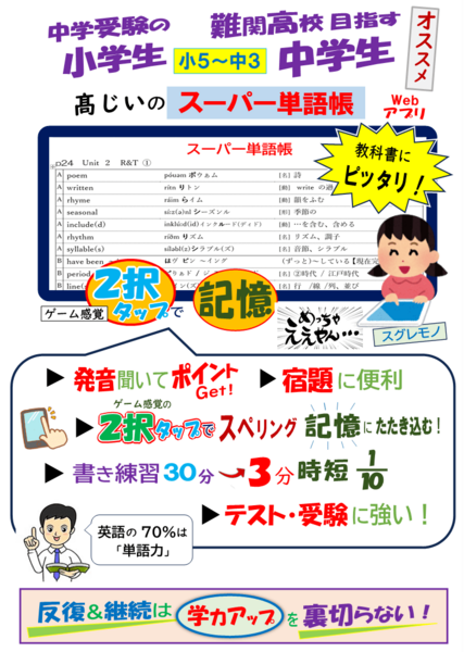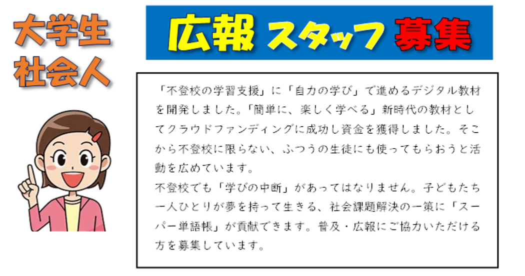 - 「スーパー単語帳」(小5~中3用)の普及に、協力いただける方を募集