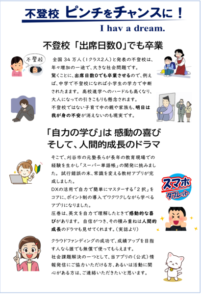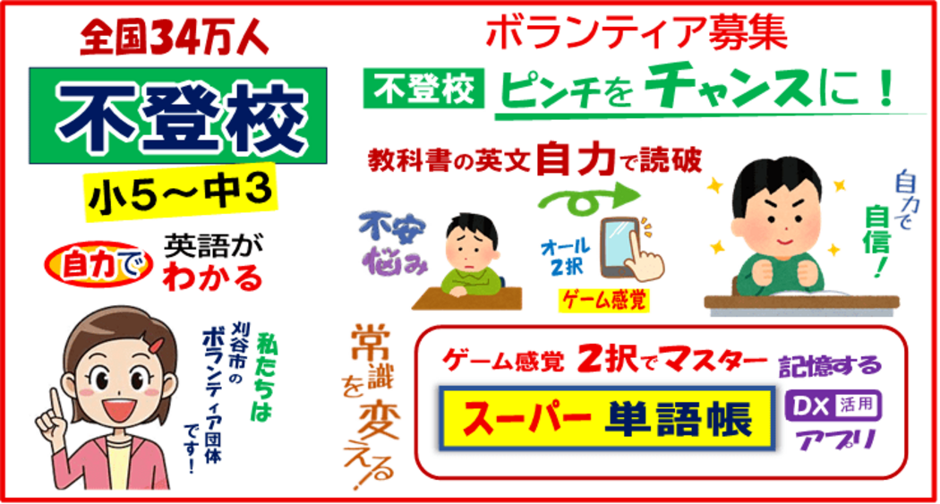 不登校「ピンチをチャンスに」と、ゲーム感覚の「スーパー単語帳」を刈谷市のボランティア団体が開発。「将来に明るい希望がある」ことを伝えたい。当アプリ(公式)情報発信を頼めるスタッフを募集しています。