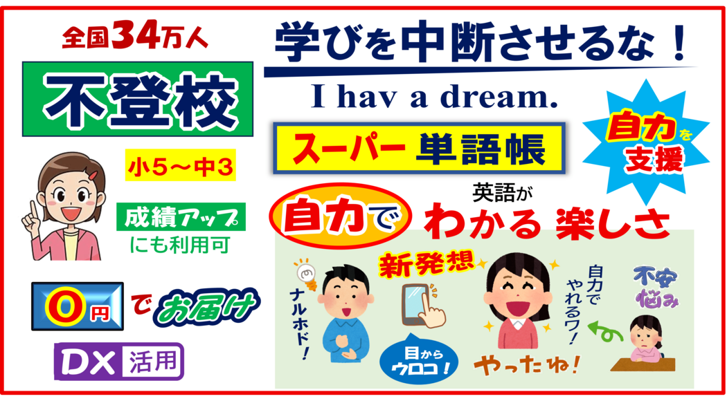 一人ひとりに明るい将来があるから、不登校でも「学びを中断」してはいけないのです。自力の学びは自分に自信がつき、人間力の向上も同時進行。自力の起点「スーパー単語帳」の情報発信スタッフを募集しています。