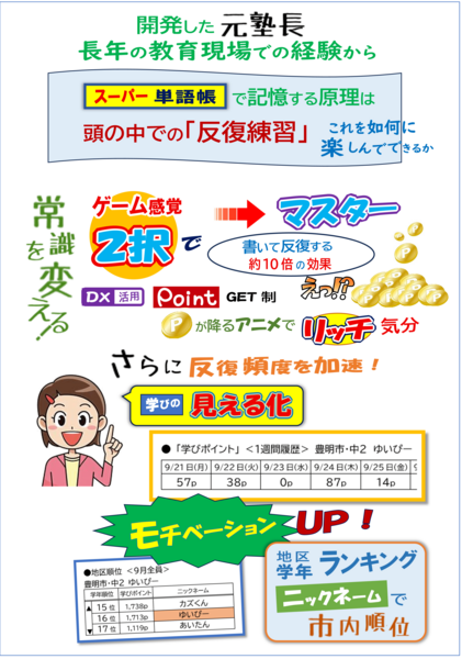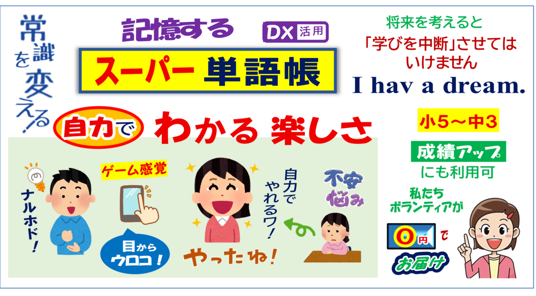 そこで、全国的にも珍しい、リハビリ的「学び支援」を刈谷市の元塾長が中心になっています。DX活用の「スーパー単語帳」開発しました。自力で、自分のペースでどんどんやれて、英語の教科書読破もスイスイ、自信がつきます。