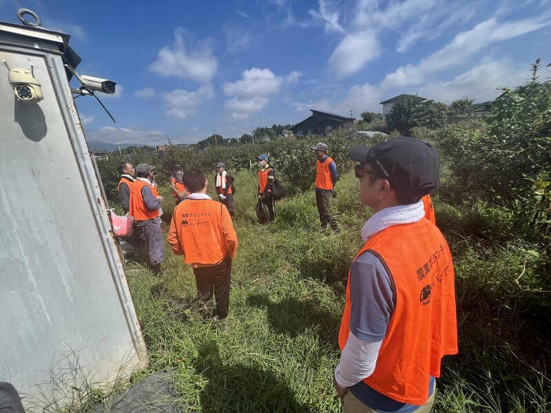 参加者さんは全員よいおやさいのビブスを着て作業します。参加メンバーがわかる上に道路などからも活動していることがわかり、一体感が生まれます。