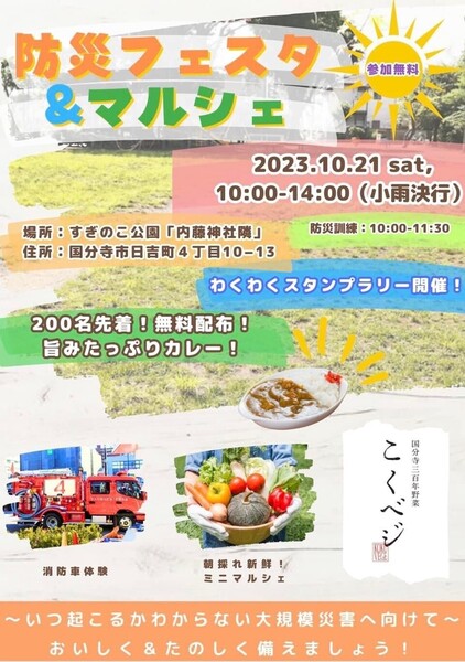 国分寺で開催される「防災フェスタ&マルシェ」にレスキューキッチンカーが出店!フード提供のお手伝いや、その他子供達と食育や防災、SDGsのクイズをして楽しみましょう^