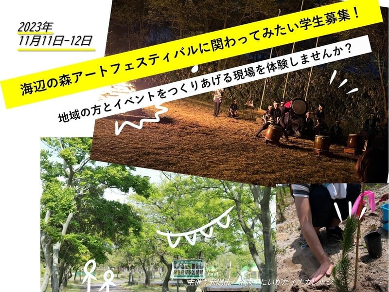 海辺の森SDGsActivityは、「ヒトと環境にやさしい」をコンセプトに、海岸清掃などの活動も行っています。今回のアートフェスティバルでは、海岸で拾った流木を活用したアート作品の展示や環境保全のパネルディスカッション、廃材を活用したキャンプファイヤーのまわりで弾き語りなどのライブも開催。そんな盛沢山の一大イベントのお手伝いを一日一緒に行うことで、さまざまな人に会い、想いの詰まったイベントを手作りでつくっていく過程に関わり、皆さんと新潟のつながりが一歩深まるといいなと考えています。