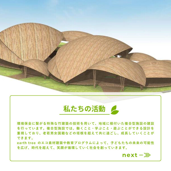 earth treeビレッジ(環境に配慮した建設様式で建造される、職場×学校×暮らしが一緒になった複合施設)を通じて、社会に目を向けることができる若者たちの成長支援を行います。