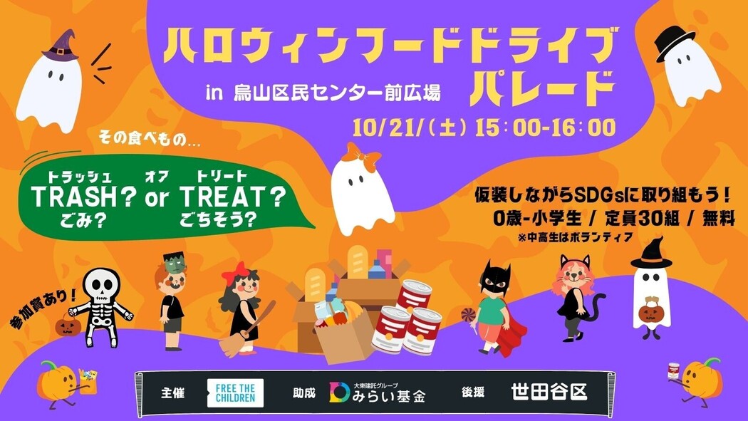ハロウィンの仮装パレードでフードドライブを同時開催! 新時代のハロウィンは、食料問題を考える日。エコなお菓子をもらって、おうちにある食べきれない食品を寄付しよう。【世界食料デー月間、食品ロス削減月間】