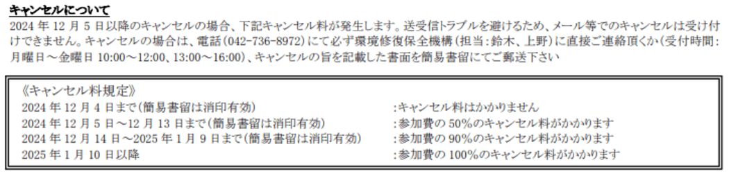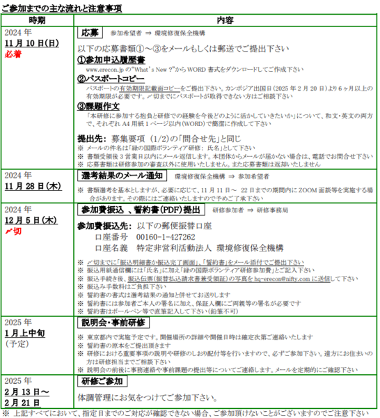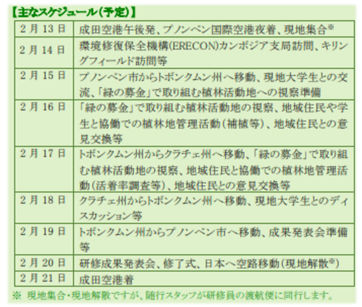 羽田・成田⇔プノンペン間往復航空券代、海外旅行保険料、現地移動費・宿泊費を含みます(査証代、パスポート取得に係る経費、感染症対策・予防接種等にかかる経費、空港までの日本国内旅費、現地滞在中の食費、その他個人的な諸経費等は含みません。海外旅行保険は環境修復保全機構が規定する補償内容となります) |