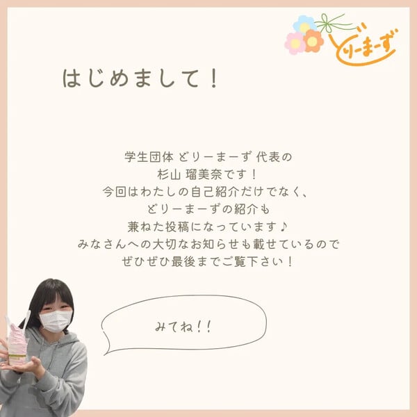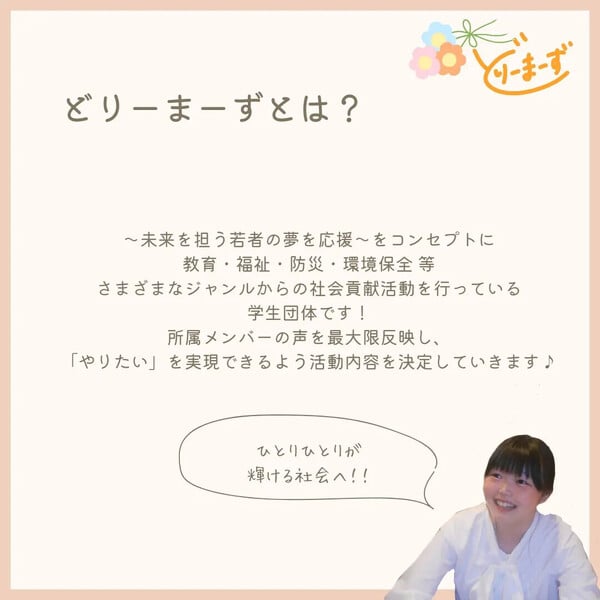 はじめまして!どりーまーずは「未来を担う若者の夢を応援」をコンセプトに教育・福祉・防災・環境保全 等 さまざまな面からの社会貢献活動を行っている学生団体です!