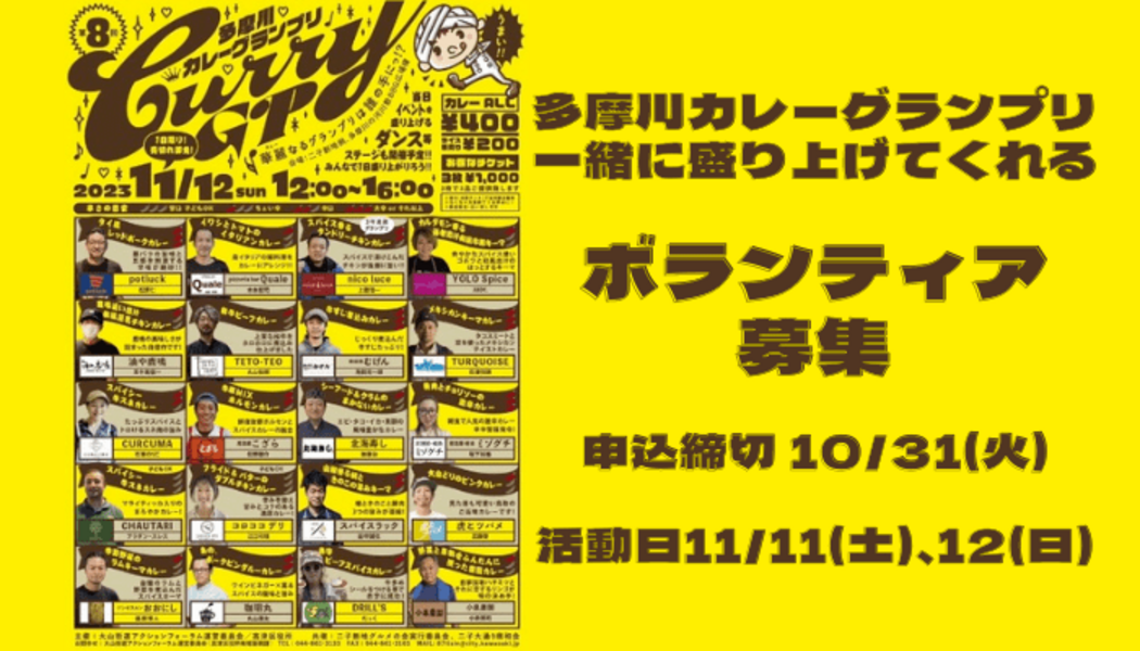 【最後に(ボランティア担当の私からメッセージ)】 カレーグランプリのボランティアは、 楽しさと充実感に満たされる素敵な経験になると思います。 高津区に住んで13年になりますが、 実はカレーグランプリに関わるのが初めてだったりします。 なので、私自身もとてもワクワクしています♪ 参加者が楽しい場にするためには、 運営スタッフが楽しんでいることが大切だと思っています。 私たちと一緒にこの街の素敵なイベントを作る仲間に なっていただけませんか、 運営スタッフ一同、 みなさまのご協力を心よりお待ちしております。 お問い合わせや質問がある場合は、お気軽にご連絡ください。 お会いできることを楽しみにしています。