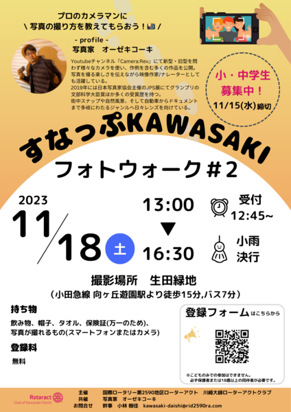 11/18(土)に子どもたちへ写真の魅力を伝えるためにフォトウォークを実施します!子どもたちと一緒に写真の楽しさや川崎の新しい魅力を発見しましょう!お子様・お孫様のいる方に是非ご参加いただきたいと思います。