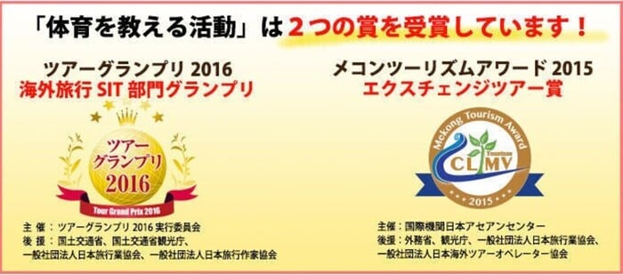 ツアーグランプリ2016実行委員会主催「ツアーグランプリ2016」にて、『カンボジア・村の小学校の子どもたちに体育を教える活動』で、海外旅行SIT部門グランプリを受賞。