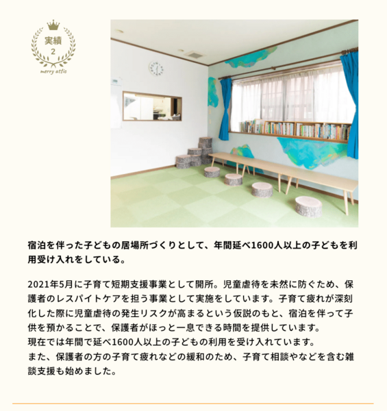 merry atticは子育て疲れが深刻化した際に、児童虐待の発生リスクが高まるという仮説を持っており、宿泊を伴って子どもを一時的に預かることによって、保護者の育児疲れを解消し、虐待を未然に防ぎます。