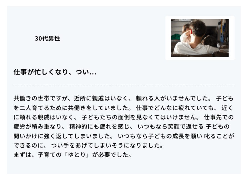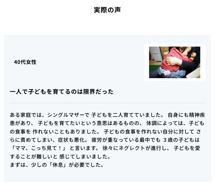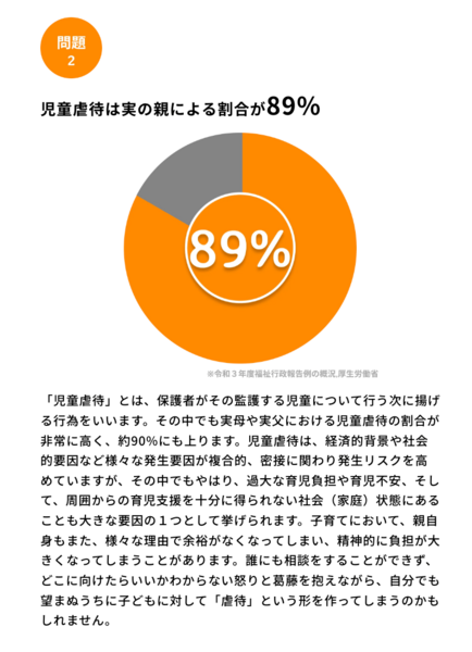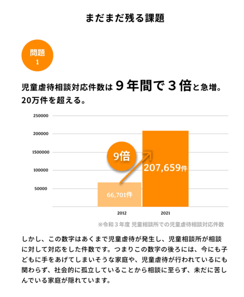 「育てられないなら産むな」 「児童相談所は何をしているんだ」 児童虐待相談対応件数が増加する今、そんな言葉も耳にする中で、伝えられることがあります。私たちは、子供を必死で愛そうとする親をたくさん見てきました。 社会から孤立し、手探りの中で、自身の父や母から与えられた苦痛を抱えながら、憂鬱な人間関係や社会生活のストレスに四苦八苦し、願って生まれた訳でもないその場所で、「私のようになってほしくない」そう願って、子供に添い遂げた、その結果だとも思います。 普段、私たちが何気なく感じている"あたりまえ"を家庭環境に囚われず、一人でも多くの人たちが享受する分。その分だけ、この世界には、夢が育ち、ずっと先の未来に繋がるのだと思います。