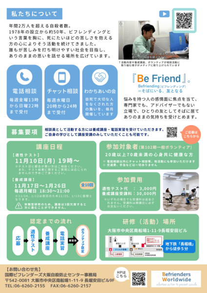 この募集の受入法人「国際ビフレンダーズ 大阪自殺防止センター」をフォローして、