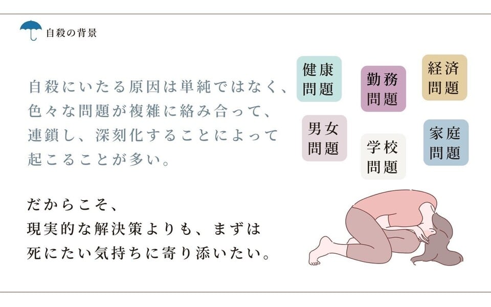 「心配かけたくない」「死にたいと言って周りにどう思われるか不安」など、その悩みを周囲の人にはなかなか打ち明けることができません。