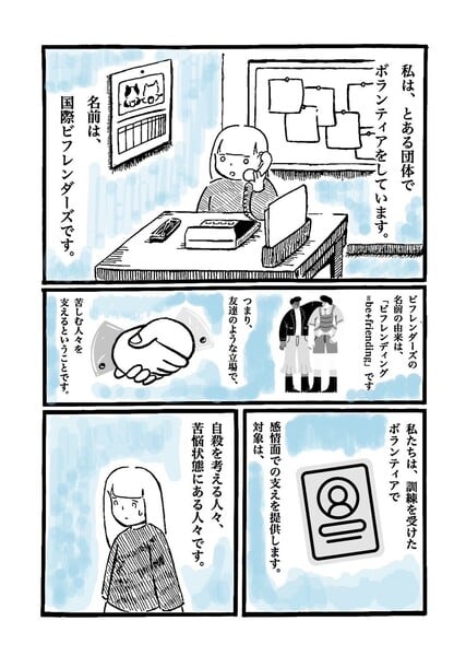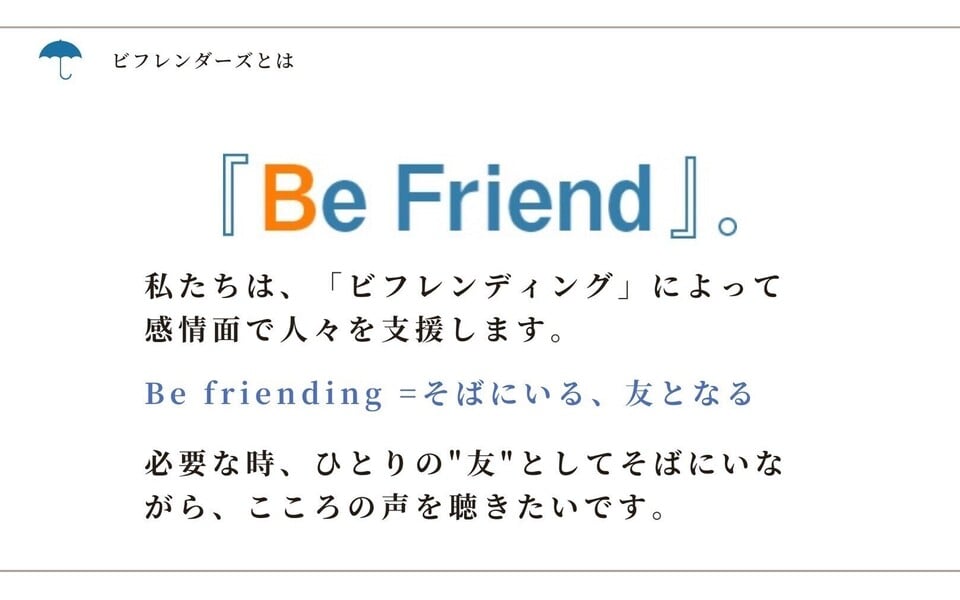 自殺を考えるほどの苦しさを抱えた人に、感情面の支援を行うことを目的にしたボランティア団体です。活動開始から47年、私たちは「ビフレンディング=be+friending」"そばにいる、友となる"という言葉を胸に、死にたいという気持ちもありのまま受けとめ、心によりそう活動をしています。