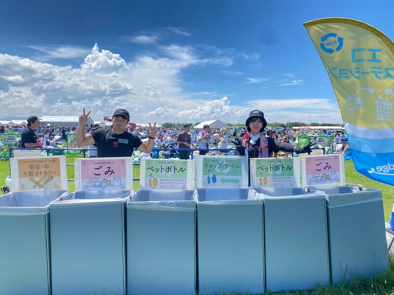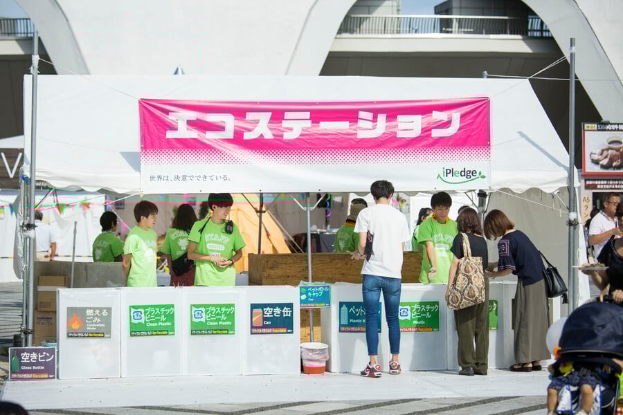 イベント会場にエコステーション(ごみ箱)を立ててボランティアが立ち、来場者に分別を呼びかけたり、繰り返し使えるリユース食器を導入して、根本的なごみの削減に取り組んだりしています。