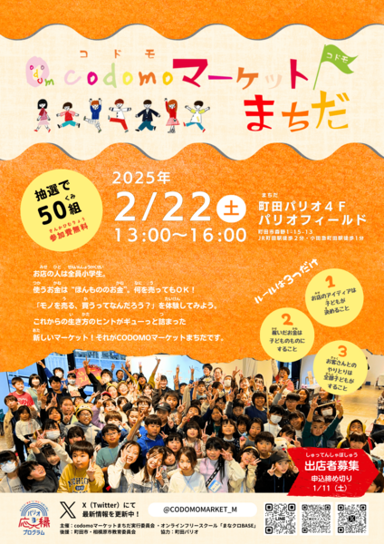 お店の人は全員小学生。使うお金は”ほんもののお金”。何を売ってもOK !そんな子どもたちのための社会体験イベント「codomoマーケットまちだ」です。第2回を開催します。お手伝い、お願いします!