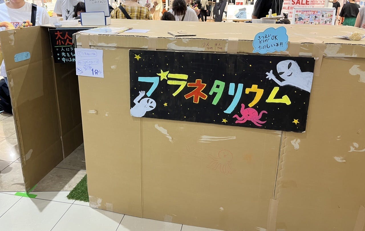 大きな段ボールで作った手作りのプラネタリウムの前で、しっかりと接客をしていました。