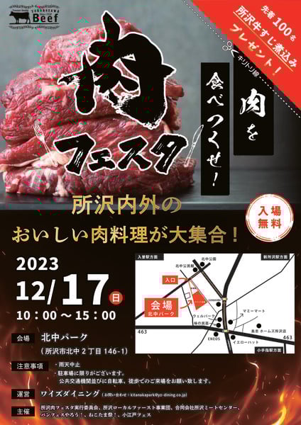 所沢市小手指の北中パークにて年間を通じて定期的にイベントを開催する事になりました。来年からは毎月イベントを開催する予定ですが、北中パーク第1弾と致しまして12月17日(日)「肉フェスタ」を開催致します