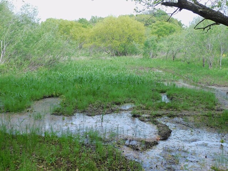 手入れが足りず、暗く、荒れてしまっています。水が湧いてサラサラと流れる明るい湿地に戻します。