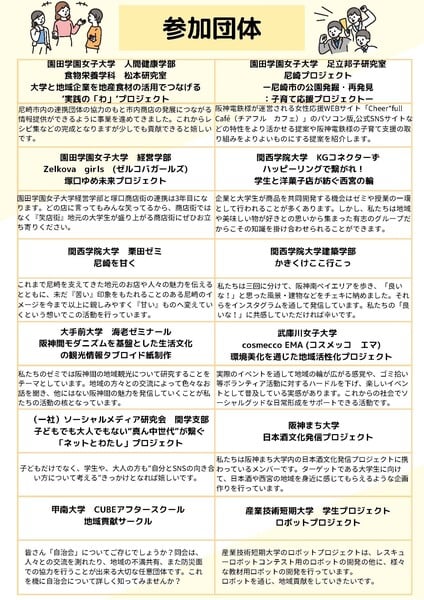 阪神地域の地域活性化活動に取り組む12の学生団体、9の地域団体・事業所が集まり、