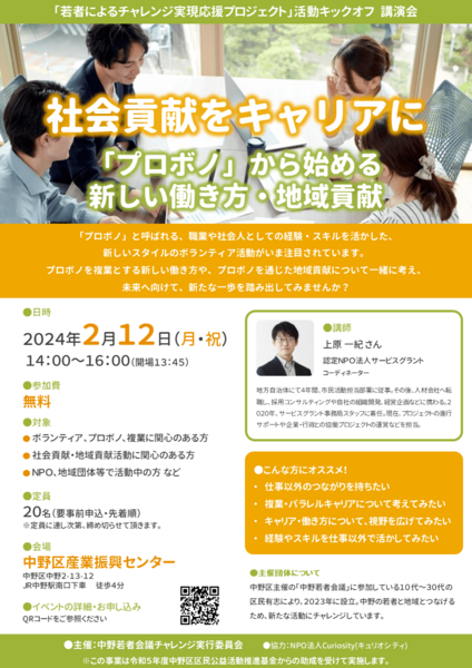 「プロボノ」と呼ばれる、社会人としてのスキルを活かしたボランティアについて考える講演会です。複業・パラレルキャリアに関心がある方、自身のキャリアについて考え、広げてみたい方におすすめです。