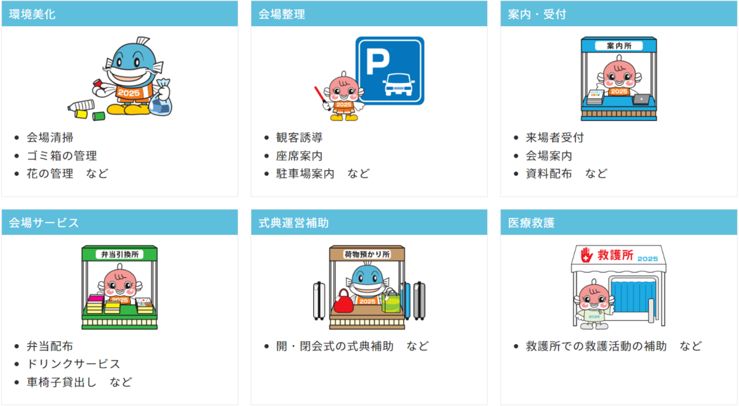 環境美化、会場整理、案内・受付、会場サービス、式典運営補助、医療救護など開・閉会式、各種競技会の運営補助等