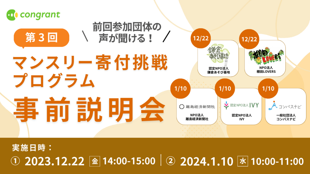 無償セミナーと伴走プログラムで新たな20人のマンスリーサポーターの獲得を目指すコングラント株式会社の「マンスリー寄付挑戦プログラム。第3回応募団体募集に伴い事前説明会を1月10日に実施します。