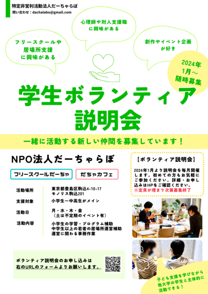 - 【説明会・研修会開催】フリースクール&カフェで支援をしたい学生ボランティア募集!