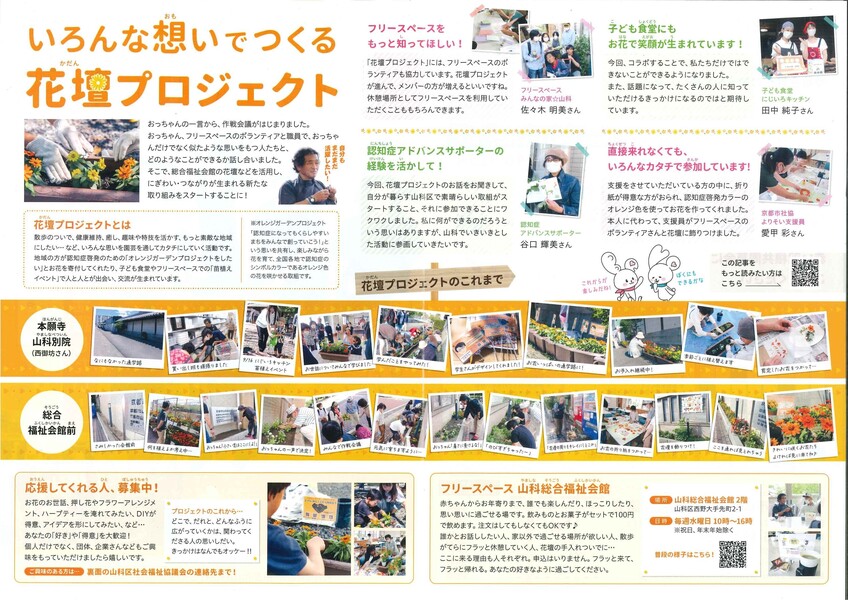 「花壇をにぎやかに!園芸を楽しみたい」「フリースペース(誰でも好きなように過ごせる場所で山科区内に現在11箇所あります!)をもっと知ってもらいたい」「認知症について考えるきっかけになればいいな」というみんなの思いが重なって始まったプロジェクトです。