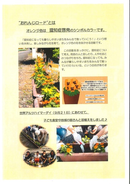 オレンジ色は認知症啓発のシンボルカラーです。「認知症になっても暮らしやすいまちをみんなで創っていこう!」という思いを共有し、楽しみながら花を育て、オレンジ色の花を咲かせる活動です。この活動をきっかけに、認知症について考え、周囲の人と話したり、人や社会とのつながりをもち、認知症になってもみんなが暮らしやすいまちをみんなで創っていけたらいいな、という目的があります。花壇プロジェクトの一つとして本願寺山科別院沿いに設置されています。