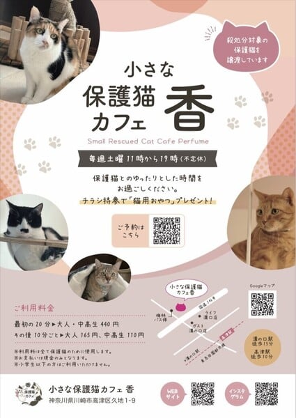 「小さな保護猫カフェ 香」では保護猫の里親探し支援として里親様とのお見合いや、譲渡に必要な人馴れの場づくりを行っています。