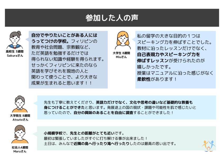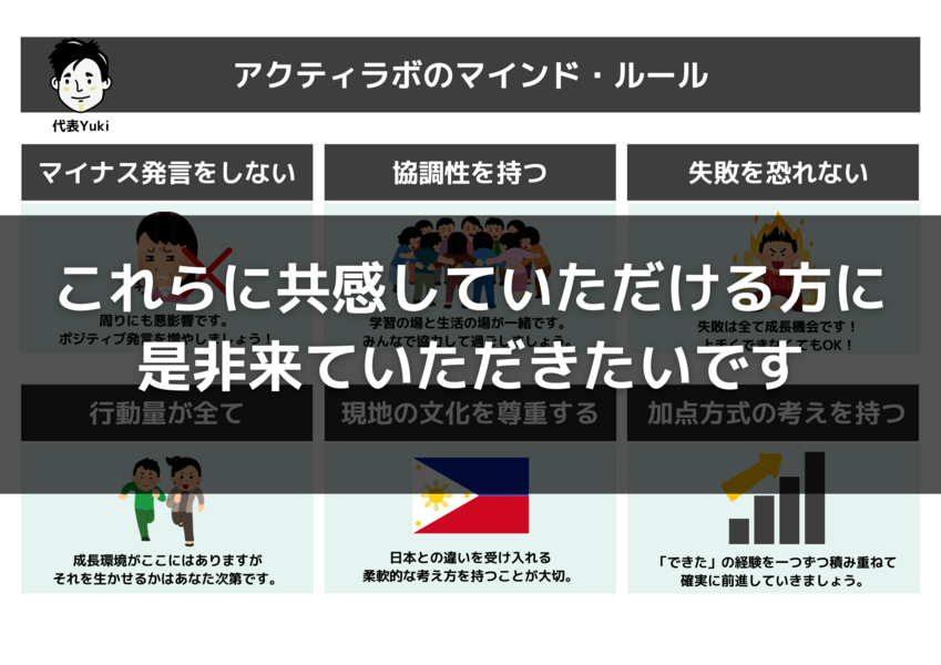 ãã®å€§ããª"åã³"ãš"æå"ãä»åŸã®ãèªèº«ã®çµ¶å¯Ÿçãªãã£ãªã¢ã«ãªããäžçã§æŽ»èºåºæ¥ã人æã«ãªãåŸããšèããŠãããŸããçåŸäžäººäžäººããè±èªïŒå¯Ÿäººã³ãã¥ãã±ãŒã·ã§ã³ããŒã«ãã«å€ããŠããããŸã§ãµããŒããããŠé ããŸãã