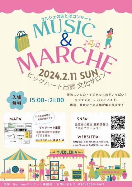 【場所】ビッグハート出雲 白のホール前(出雲市駅南町1-5)(マルシェ15時開始のため、準備から~演奏会20:30終演後にマルシェで買い物される方もいらっしゃるので21時マルシェ閉店後の片付けまでお手伝いいただけると嬉しいです) イベント当日の会場運営のお手伝い