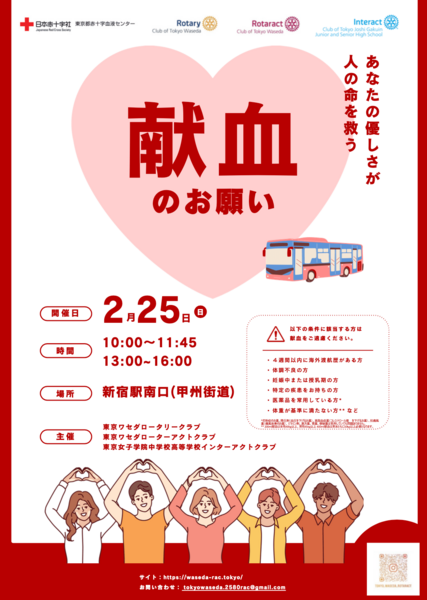 2024年2月25日(日)新宿駅南口で献血活動(10:00-16:00)を行います。献血後お時間がある方はぜひ呼び込みのボランティアのご協力をお願いします!