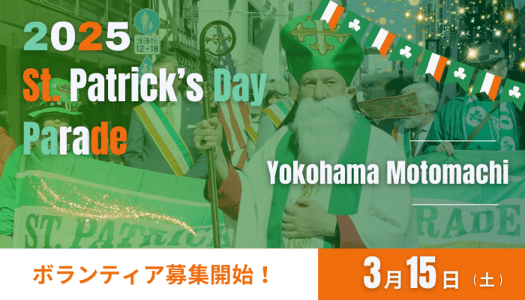 2025年3月9日に横浜元町ショッピングストリートで開催される国際色豊かなセントパトリックデーパレードを一緒に盛り上げてくれるボランティアさんを募集します。