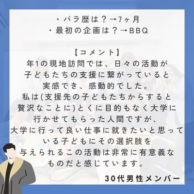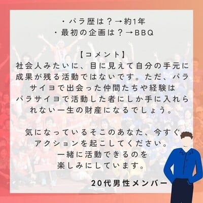 PARASAIYOでは、以下のような様々な思いを持ったメンバーが幅広く活動しています。