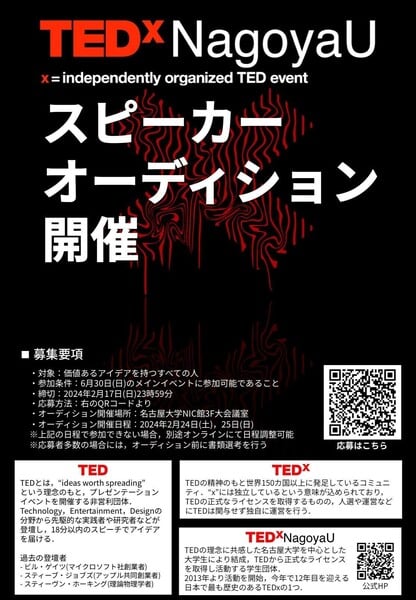 TEDxNagoyaUでは2024年6月30日(日)に開催予定のメインイベントの登壇者を募集しております。