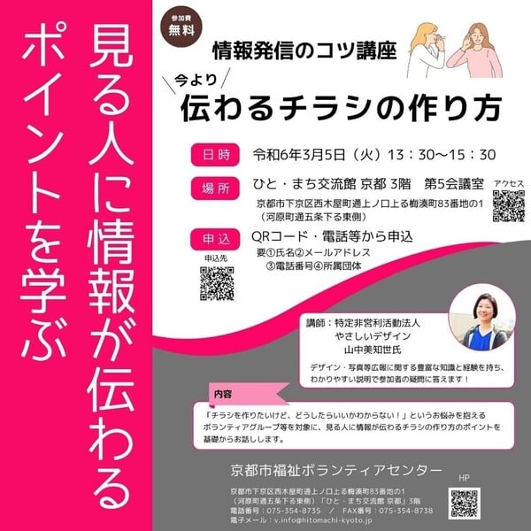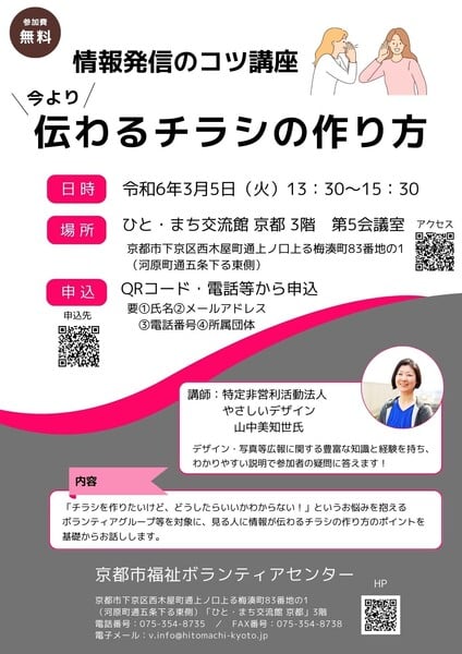 「チラシを作りたいけど、どうしたらいいかわからない!」というお悩みを抱えるボランティアグループ等を対象に、見る人に情報が伝わるチラシの作り方のポイントを基礎から学びます!